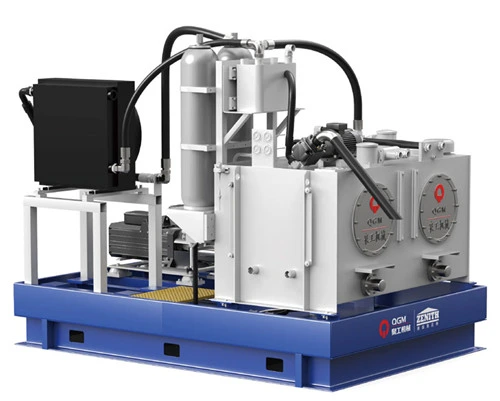 bevægelse. Den hydrauliske station anvender en stempelpumpe med variabel slagvolumen, som stopper