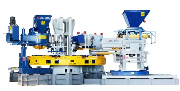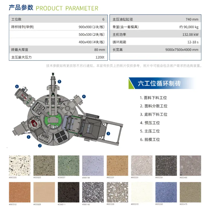 HP-1200T Roterende bord statisk presse adskiller kreativt murstensfremstillingsprocessen i 7 stationer, arrangeret i et cirkulært layout, hvilket reducerer gulvpladsen og har et stort støbeareal og støbehøjdeområde, hvilket sikrer, at kundernes forskellige krav til imiterede stenbetonblokkeprodukter opfyldes, og udfylder hullet i hjemmelig efterligning af 7-stations murstensmaskiner. Dens formulerede gruppestandard "T/CCMA 0125-2022 Rotary Multi-station Static Press Concrete Block Forming Machine" er blevet udvalgt som et af de 100 gruppestandardapplikationsdemonstrationsprojekter i ministeriet for industri og informationsteknologi i 2023.
